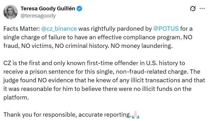 Криптовалютный адвокат CZ Тереза Гуди Гильен в четверг заявила, что помилование было правильным решением, поскольку её клиент «был обвинён лишь в отсутствии эффективной программы соответствия требованиям. НИКАКОГО мошенничества, НИКАКИХ жертв, НИКАКОЙ криминальной истории. НИКАКОГО отмывания денег».