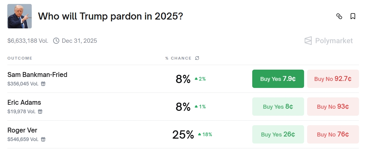 Объем ставок в прогнозах Polymarket о том, кого помилует президент США Дональд Трамп, достиг $6,6 млн. По оценкам участников, шансы Роджера Вера, известного как Биткоин Иисус, выросли на 18% за сутки после того, как 23 октября был помилован основатель криптобиржи Binance Чанпэн Чжао.