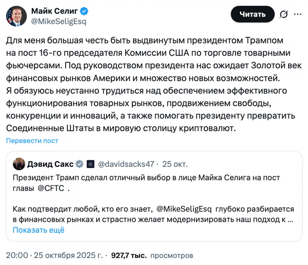 В публикациях на X в субботу Селиг и координатор Белого дома по криптовалютам и искусственному интеллекту Дэвид Сакс подтвердили сообщения о том, что Трамп выдвинет Селига на пост председателя CFTC. Это закладывает основу для ухода исполняющей обязанности председателя Каролины Фам.