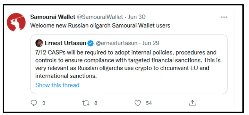 В правительственном документе приводится ссылка на переписку в WhatsApp от 2018 года, в которой Родригес назвал перемешивание криптовалют «отмыванием денег». В 2020 и 2023 годах Хилл якобы продвигал Samourai на даркнет-форумах, утверждая, что проект «очистит грязный биткоины» и сделает их «неотслеживаемыми».