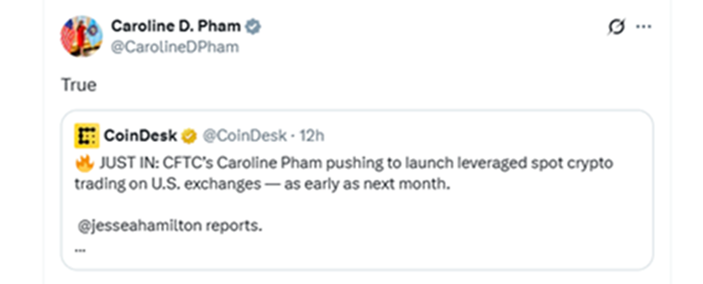 Комиссия по торговле товарными фьючерсами США (CFTC) ведет переговоры с регулируемыми биржами о запуске спотовых криптовалютных продуктов, включая инструменты с левериджем. Это подтвердила и. о. главы ведомства Кэролайн Фам.