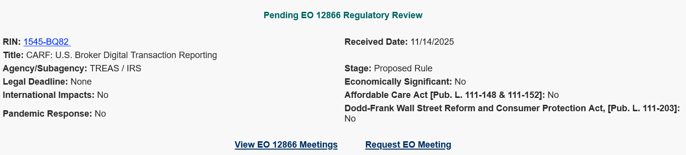 Подробная информация о предложении по отчетности о цифровых транзакциях брокеров, представленном в Белый дом. Источник: US Government.