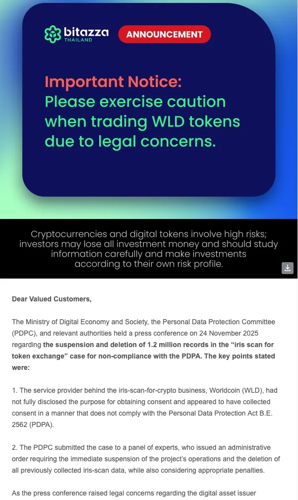 «Поскольку на пресс-конференции были подняты правовые вопросы, касающиеся эмитента цифровых активов Worldcoin (WLD), и поскольку эта информация может повлиять на права и интересы пользователей, Bitazza рекомендует всем юзерам проявлять осторожность при торговле или хранении токенов WLD», — говорится в уведомлении биржи.