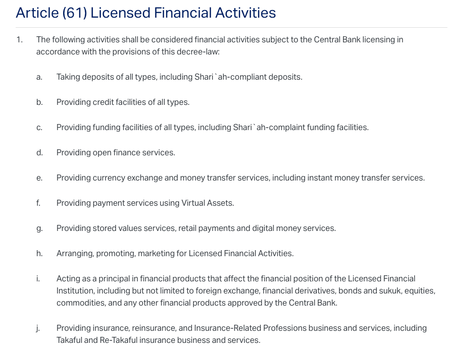 В его ключевых положениях, статьях 61 и 62, содержится список видов деятельности, требующих лицензии Central Bank of the UAE (CBUAE), включая криптовалютные платежи и цифровые активы.