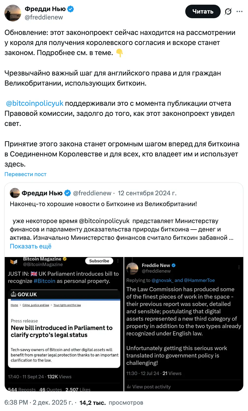 Фредди Нью, руководитель по политике в организации Bitcoin Policy UK, назвал принятие закона «огромным шагом вперед для биткоина в Британии и для всех, кто им владеет и использует».