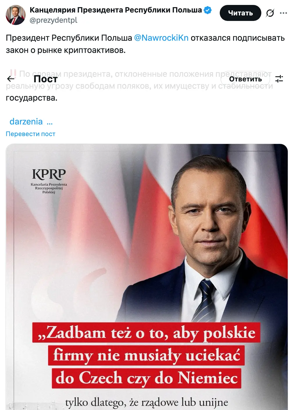 Как сообщило агентство Bloomberg в пятницу, законопроект, предложенный правительством премьер‑министра Дональда Туска, должен был привести регулирование криптовалютного рынка Польши в соответствие с рамками MiCA (Markets in Crypto‑Assets) ЕС. Документ внесли на рассмотрение в июне, но он не прошел через вето президента.