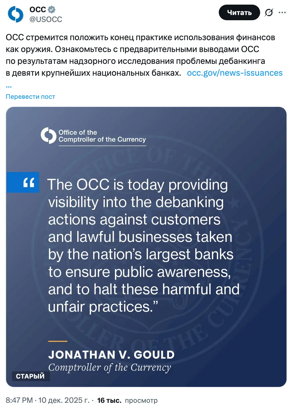 «Прискорбно, что крупнейшие банки страны сочли эти вредные практики отказа в обслуживании уместным использованием предоставленных государством полномочий и рыночной власти», — заявил валютный контролер Джонатан Гулд.
