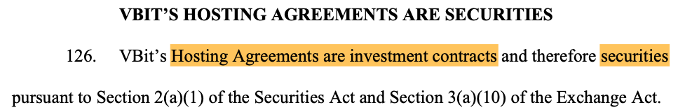 Выделенный фрагмент из иска SEC, в котором утверждается, что соглашения о хостинге VBit — это ценные бумаги. Источник: SEC
