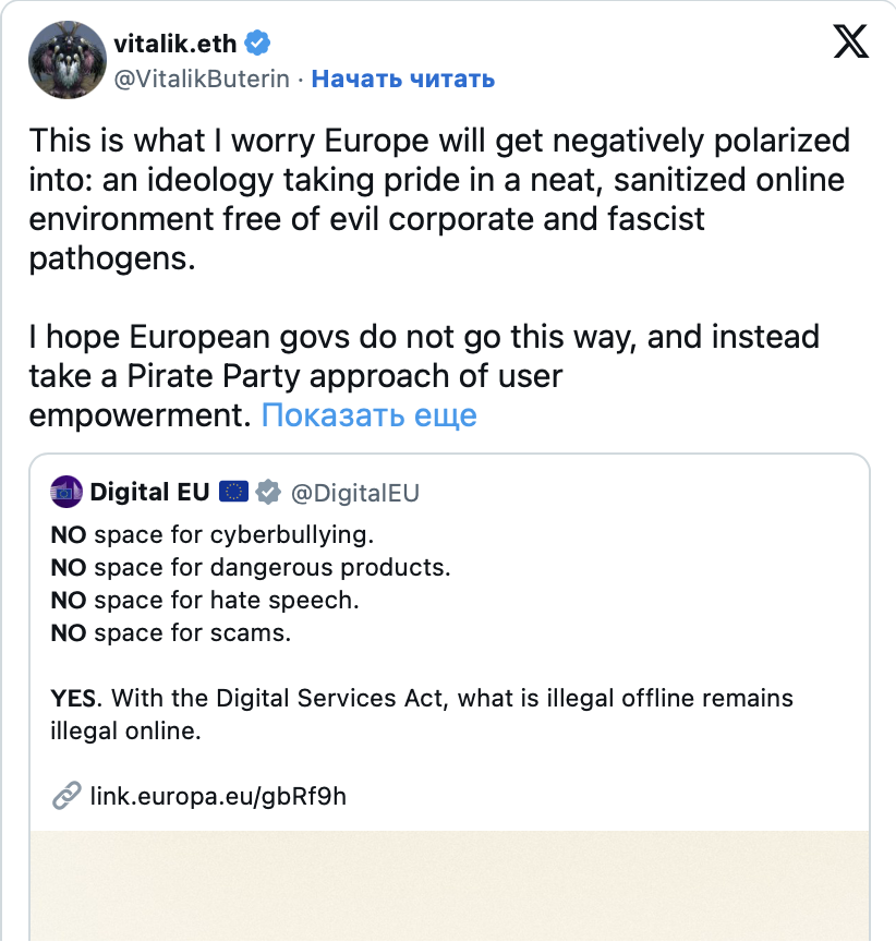 Сооснователь Ethereum Виталик Бутерин выразил обеспокоенность текущим подходом Европейского союза к регулированию интернета. По его мнению, реализация Закона о цифровых услугах (DSA) несет риски для плюрализма мнений. Стремление регуляторов не оставить «ни единого места» для спорных высказываний может привести к созданию стерильной цифровой среды.