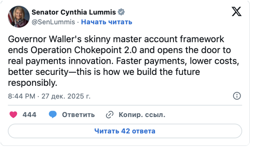 Она подчеркнула, что четкие правила необходимы для стимулирования инноваций в США. Это сообщение появилось всего через день после того, как сенатор от штата Вайоминг рассказала о другом ключевом прорыве в сфере регулирования: план губернатора Уоллера по созданию тощих основных счетов.