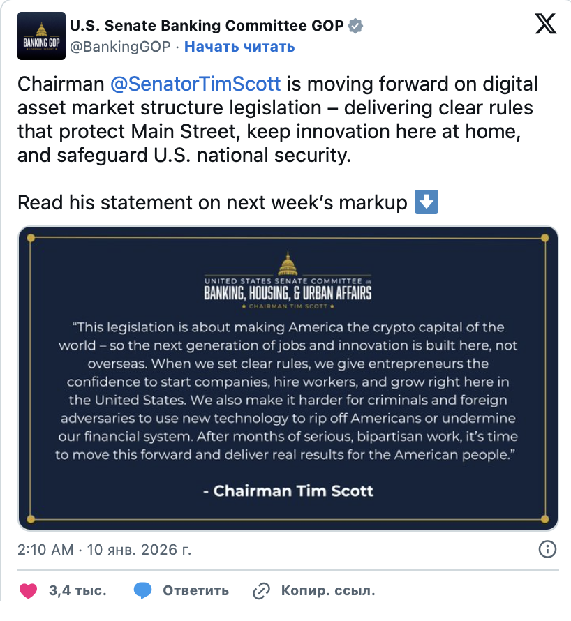 Председатель банковского комитета Тим Скотт курирует прохождение законодательства. Он заявил, что новые правила призваны сбалансировать инновации и безопасность.