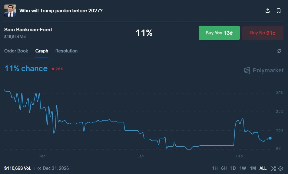 На Polymarket вероятность того, что Трамп помилует Бэнкмана-Фрида до конца 2026 года составляет 11%.