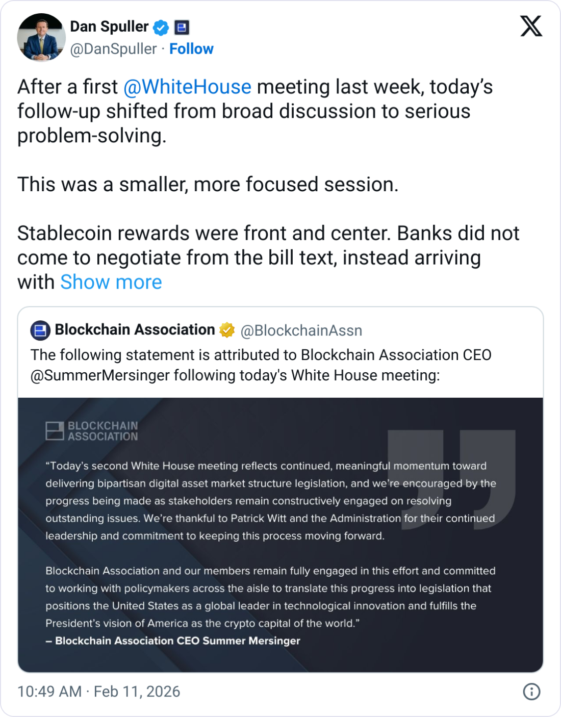 Дэн Спуллер из Blockchain Association назвал встречу «более сфокусированной на решении серьезных проблем».