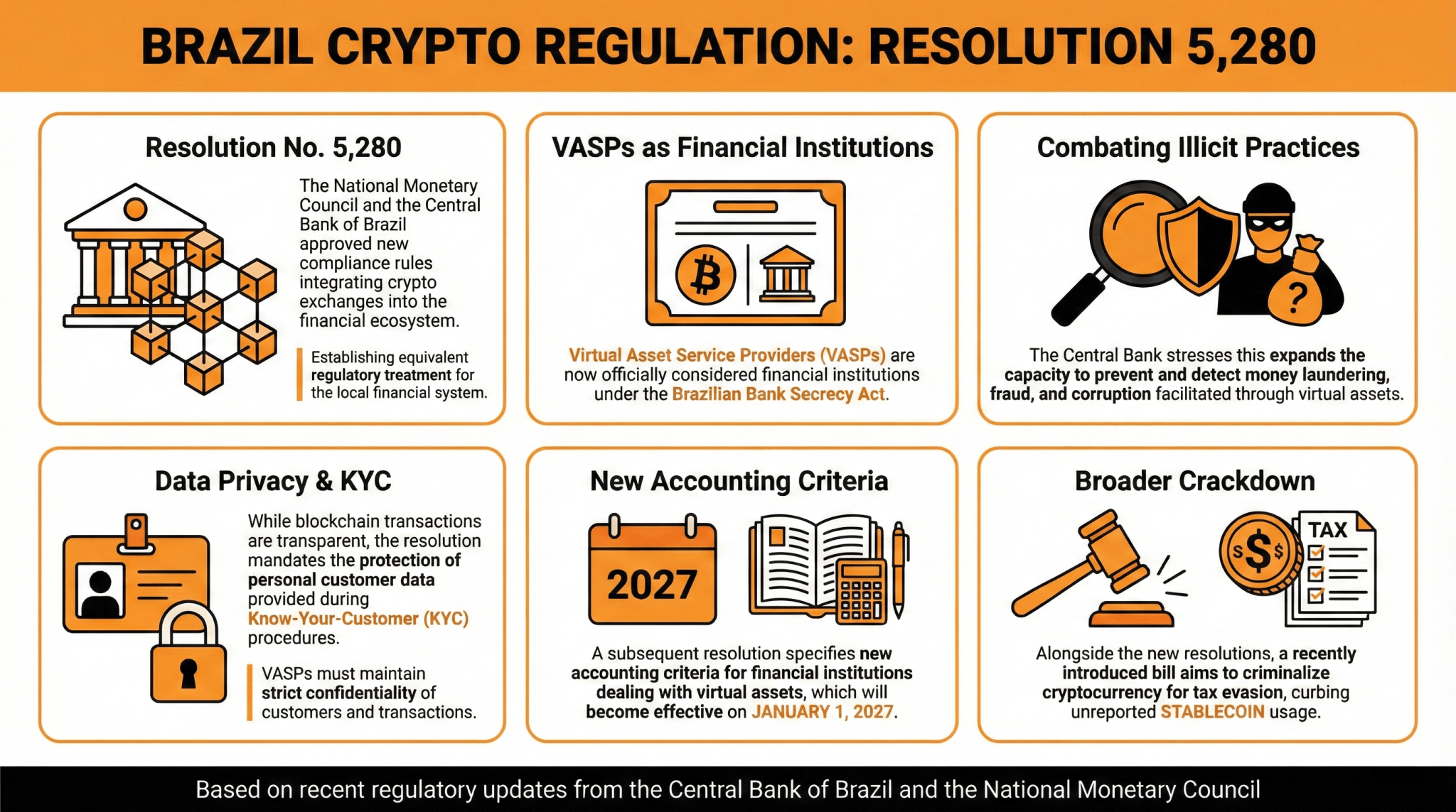Несмотря на прозрачность транзакций в блокчейне, учитывая природу этих структур, такие эксперты, как Тьяго Северо, подчеркивают, что цель этого постановления — защитить идентификационные и персональные данные клиентов, предоставленные при прохождении процедуры «Знай своего клиента» (Know Your Customer, KYC).