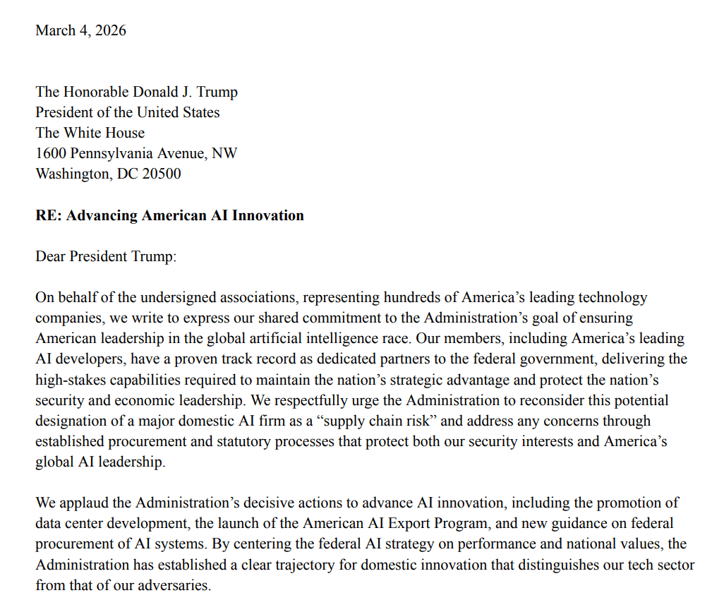 Технологические ассоциации США призвали президента страны Дональда Трампа пересмотреть решение о признании компании Anthropic угрозой для цепочки поставок. По их мнению, такой шаг может иметь негативные последствия для всей отрасли.