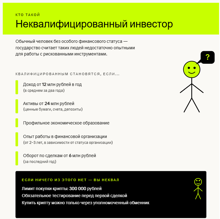 Законопроект предусматривает ограничение для неквалифицированных инвесторов: максимум 300 тысяч рублей в год на покупку криптоактивов через российские площадки. Квалифицированные инвесторы от этого лимита освобождены. Получение статуса квала требует демонстрации опыта и знаний, но процедура относительно несложная. Вопрос в том, стоит ли потратить время на его получение и какие условия будут предъявляться.
