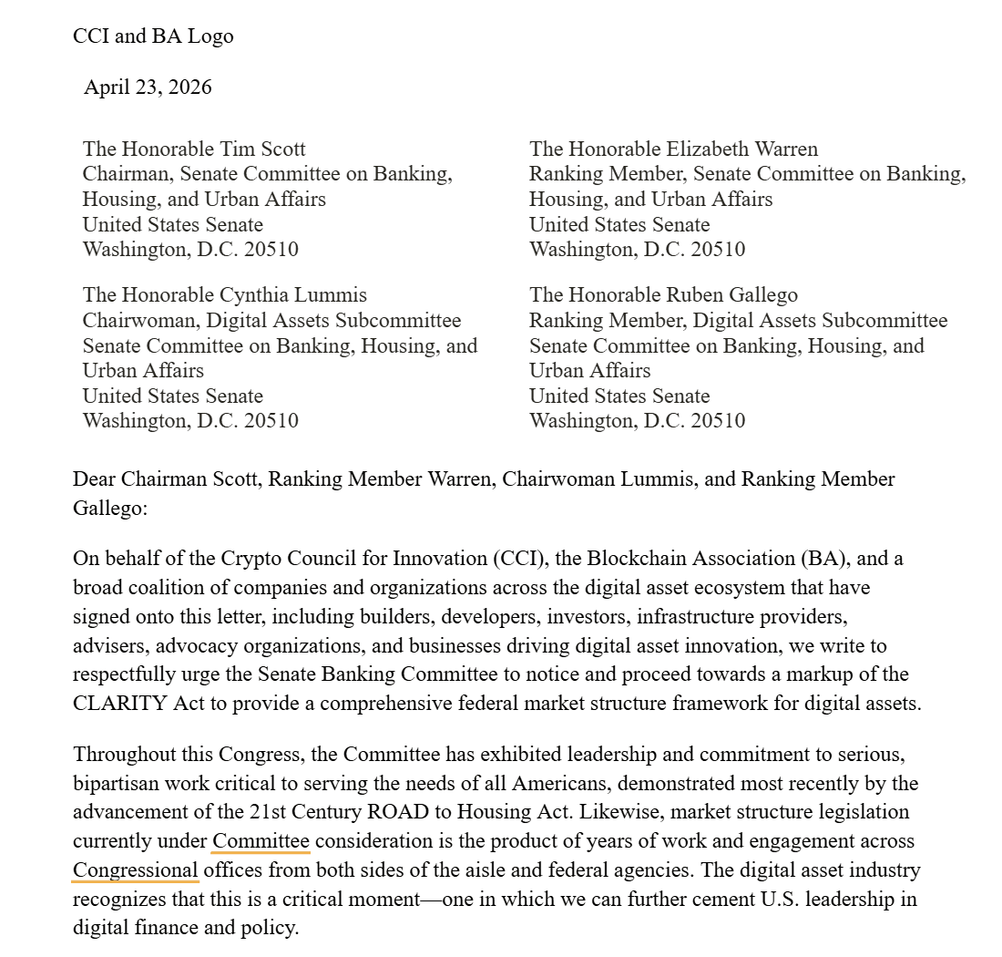 Авторы письма призвали законодателей «обратить внимание на CLARITY Act и приступить к его доработке». Они подчеркнули, что дальнейшие задержки недопустимы на фоне усиления конкуренции со стороны других юрисдикций.