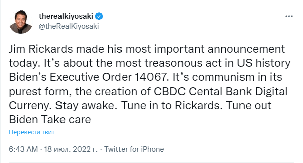 В твите от 18 июля Кийосаки назвал указ президента Джо Байдена «самым предательским за всю историю США». Более того, она назвал эту идею «коммунизмом в чистом виде».