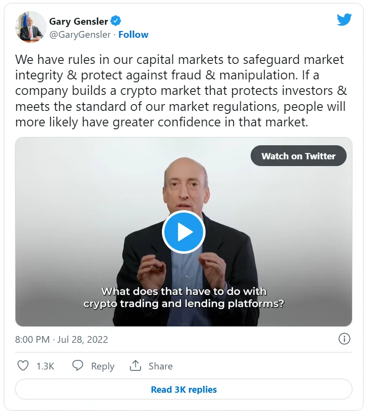 Что произошло? Председатель Комиссии по ценным бумагам и биржам США (SEC) Гэри Генслер поручил своим сотрудникам напрямую взаимодействовать с криптовалютными биржами для того, чтобы те прошли регистрацию и могли регулироваться. В Twitter он опубликовал видео, где заявил, что «нет причин относиться к рынку криптовалют по-другому только потому, что используется другая технология». Генслер считает, что регулятор должен работать с криптобиржами также, как и с биржами ценных бумаг.