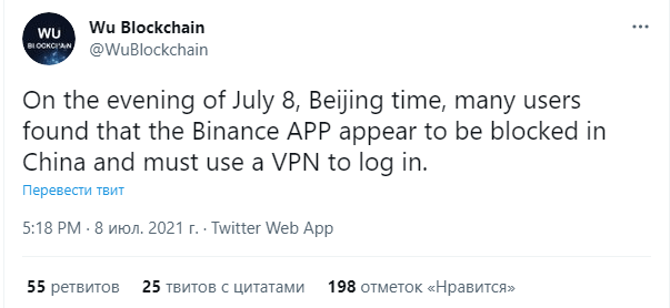 Вечером 8 июля по пекинскому времени многие пользователи обнаружили, что приложение Binance заблокировано в Китае и для входа в систему необходимо использовать VPN.