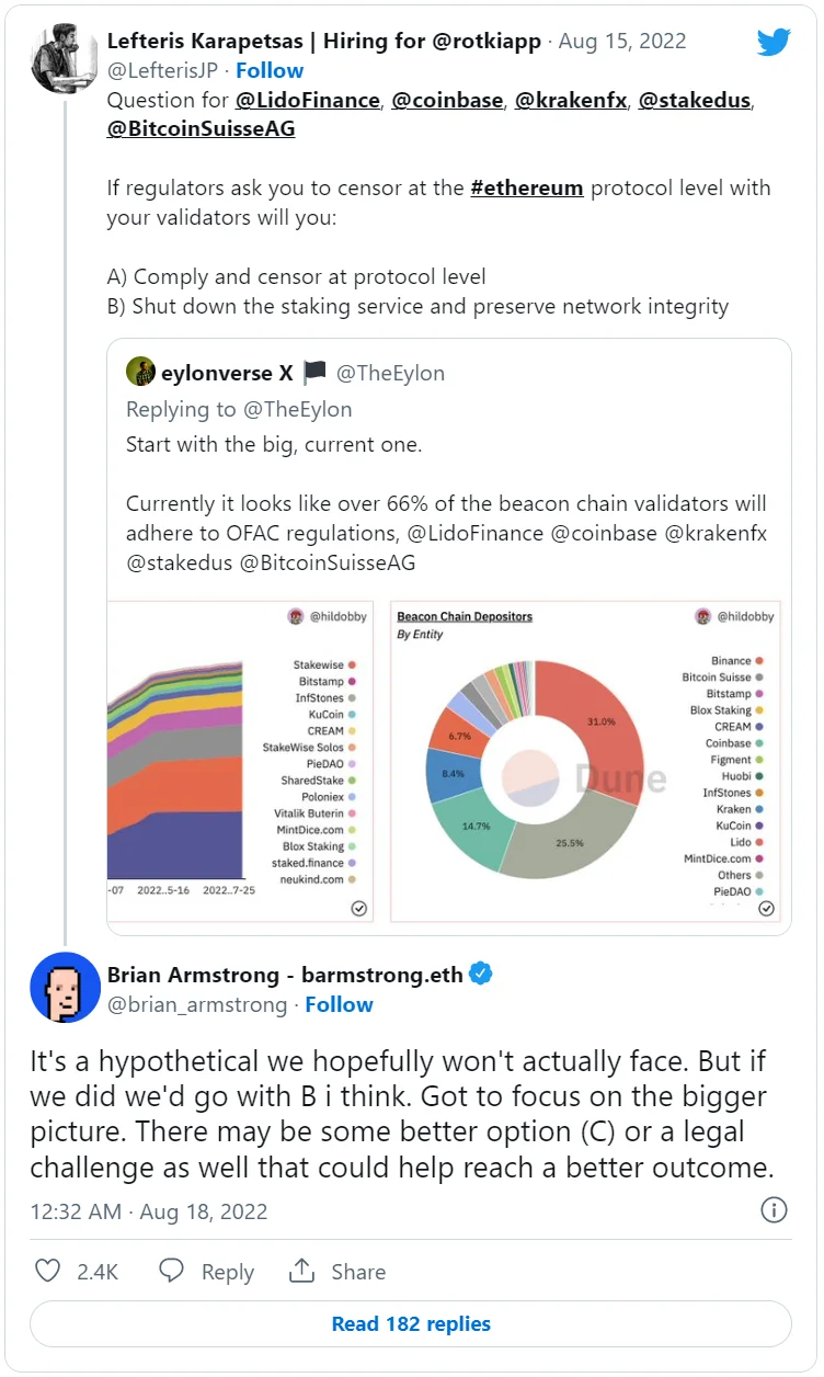 Что произошло? Генеральный директор криптобиржи Coinbase Брайан Армстронг заявил, что платформа прекратит участвовать в стекинге ETH, если регуляторы США потребуют цензурировать транзакции. Этим заявлением Армстронг ответил основателю проекта Rotkiapp Лефтерису Карапетсасу. Последний поинтересовался, что предпримут представители криптоиндустрии, если Управление по контролю за иностранными активами США (OFAC) потребует провести цензуру на уровне протокола Ethereum. Карапетсас предложил два варианта: соблюдение и цензура на уровне протокола либо отключение сервиса стекинга.