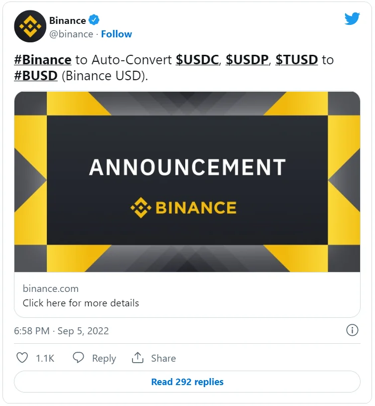 Что произошло? Криптовалютная биржа Binance объявила о том, что начнет автоматическую конвертацию существующих и новых депозитов стейблкоинов USDC, USDP и TUSD в собственную стабильную монету Binance USD (BUSD) в соотношении 1:1. Компания заявляет, что этот шаг повысит ликвидность и эффективность использования капитала для клиентов платформы. Представители биржи отметили, что нововведения никак не повлияют на вывод средств, пользователи по-прежнему смогут выбирать необходимую им стабильную монету. Изменения вступят в силу 29 сентября.
