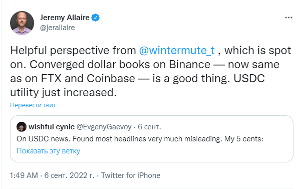Генеральный директор Circle Джереми Аллер написал в Твиттере, что «объединение долларовых книг на Binance… это хорошо. Функциональность USDC только увеличилась».