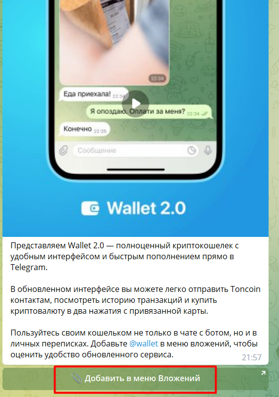 После этого в строке набора сообщений при нажатии на значок скрепки будет появляться меню кошелька wallet.
