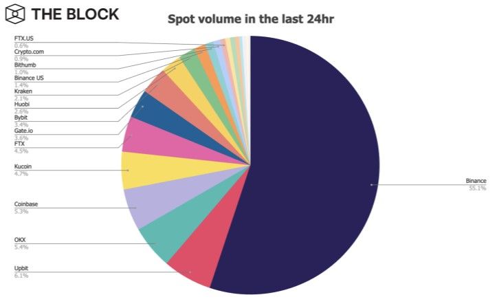 За последние сутки именно на платформе Binance было совершено 55% общего объема сделок на спотовом рынке.