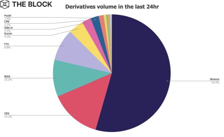 Аналогичная ситуация сложилась на рынке криптовалютных деривативов: Binance обработала 54.4% сделок по объему за последние сутки. Среди остальных площадок доли распределились так: на платформе OKX было совершено 14.1% объема сделок, на Bybit 10.2%, на FTX 8.8%.