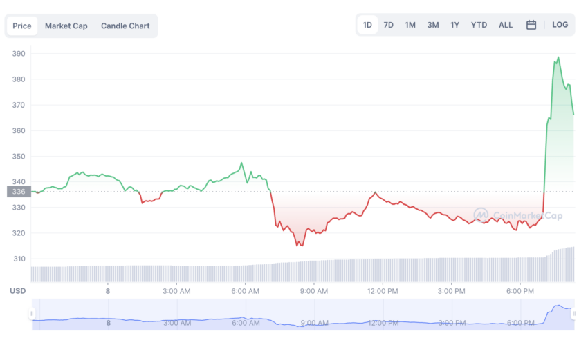 На фоне новостей о договоренностях Binance и FTX токен криптобиржи Binance (BNB) резко вырос, поднявшись в пике более чем на 20% и в моменте протестировал отметку $400. На момент публикации BNB торгуется на уровне $367,12.