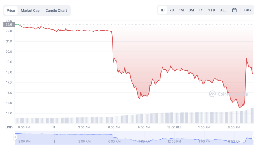 После взлета BNB цена FTT также резко выросла. Токен отскочил после сильного падения. В пике цена токена поднималась на 20% до $19,33.