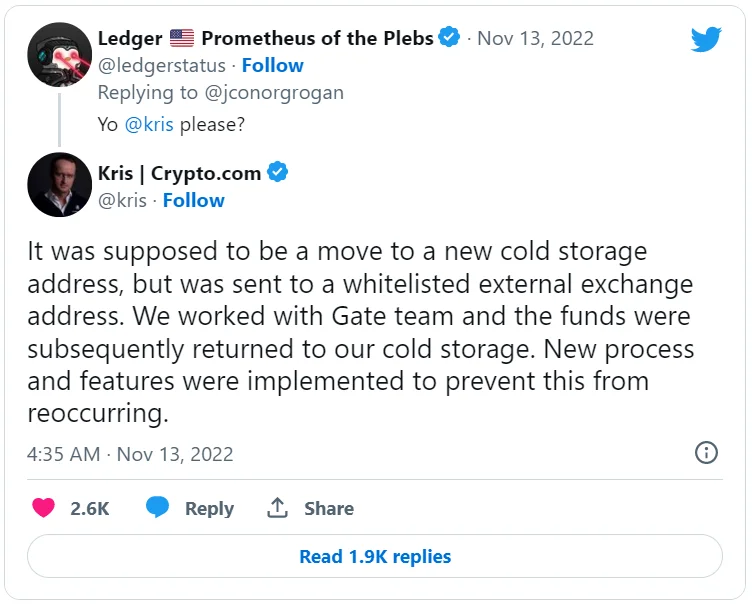 11 ноября криптобиржа Crypto.com также опубликовала данные о резервах в размере 2,9 млрд долларов. 13 ноября стало известно, что биржа после публикации отчета отправила более 280 000 ETH с холодного кошелька на торговую платформу Gate. Гендиректор Crypto․com Крис Маршалек заявил, что транзакция была ошибочной. Он объяснил, что биржа работала с командой Gate, и впоследствии средства были возвращены в холодное хранилище Crypto․com.