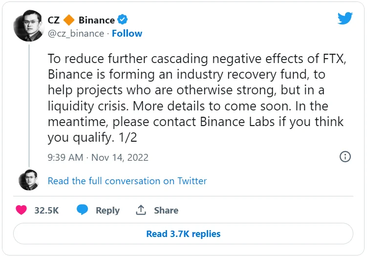 Что произошло? 14 ноября глава биржи Binance Чанпэн Чжао анонсировал создание фонда восстановления криптоиндустрии, чтобы помочь «сильным проектам, которые переживают кризис ликвидности». Он призвал компании, подходящие под требования, связаться с Binance Labs. По словам Чжао, инициатива «уменьшит каскадное негативное влияние на индустрию после краха торговой платформы FTX». Он также пригласил другие крупные компании поучаствовать в создании фонда. Подробная информация об инициативе появится в ближайшее время.