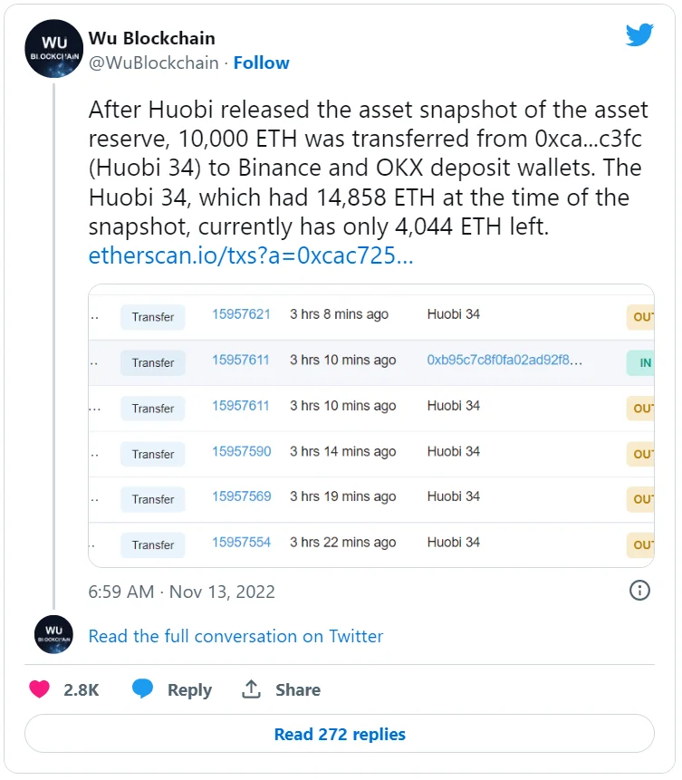 На следующий день криптобиржа Huobi также выпустила отчет по резервам, сразу после чего перевела 10 000 ETH с одного из своих кошельков на платформы Binance и OKX. На это обратил внимание аналитик Колин Ву.