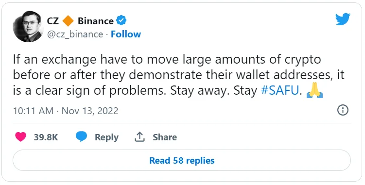 Позднее Чжао назвал «явным признаком проблем» тот факт, что биржи перемещают большие объемы криптовалют накануне публикации отчетов или сразу после демонстрации своих кошельков, и призвал «держаться подальше [от подобных компаний]».
