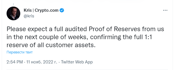 Кроме того, он повторил, что биржа хранила на FTX криптоактивы на сумму менее $ 10 млн, а Cronos не используется в качестве залога для кредитов. Биржа также готовит Proof-of-Reserves, данные с подтверждениями резервов, которые будут опубликованы в течение следующих недель, чтобы успокоить своих клиентов.