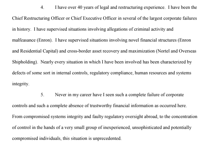Напомним, Джон Рэй III вёл дело обанкротившегося в 2001 году энергетического гиганта Enron Corporation. В то время это был крупнейший скандал с банкротством корпорации в истории США, но Рэю всё же удалось вернуть как минимум 20 миллиардов долларов в руки обманутых инвесторов.