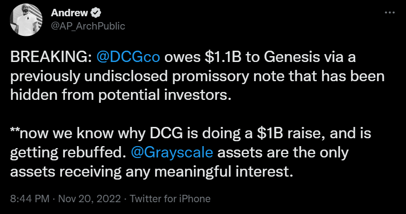 Соучредитель инвестиционной фирмы ArchPublic Эндрю Периш сообщил со ссылкой на собственные источники, что кредитное подразделение Genesis не может собрать необходимый миллиард долларов для поддержки ликвидности. По его словам, DCG отказались поддержать как минимум Майк Новограц (Galaxy Digital) и близнецы Уинклвосс (Gemini).
