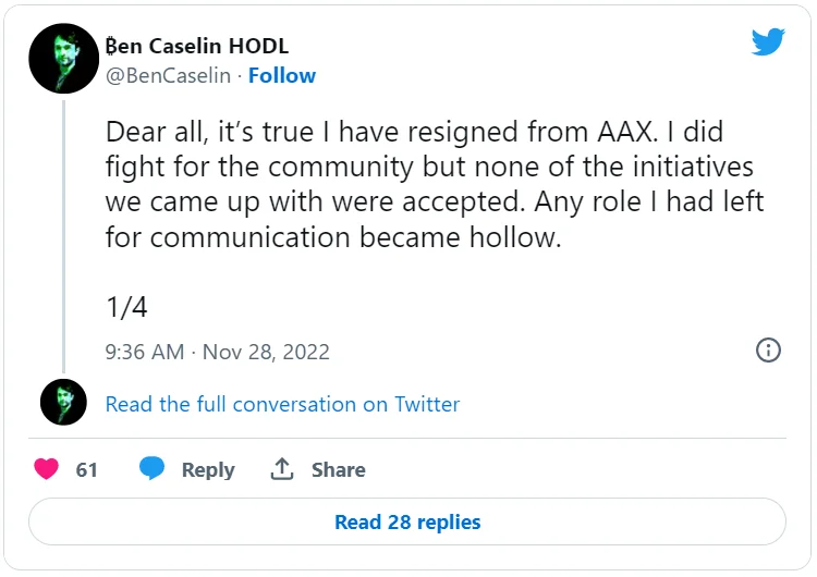Что еще сообщил Каселин? Бывший вице-президент AAX заявил, что вкладывался в биржу и использовал ее как платформу для просвещения. Он все еще верит в хороший исход, но «бренда уже нет и доверие подорвано».
