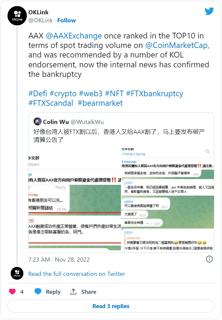 Что произошло? Аналитическая платформа OKLink со ссылкой на аналитика Колина Ву заявила о банкротстве приостановившей торги криптобиржи AAX. В OKLink отметили, что ранее платформа входила в топ-10 по объему спотовой торговли на CoinMarketCap и была рекомендована рядом инфлюенсеров. Кроме того, вице-президент AAX Бен Каселин объявил об увольнении из компании. Он заявил, что до последнего боролся за сообщество, но ни одна из предложенных им инициатив не была принята.