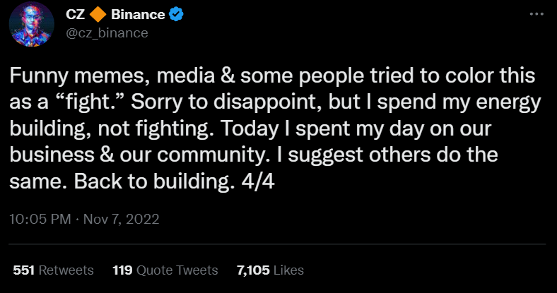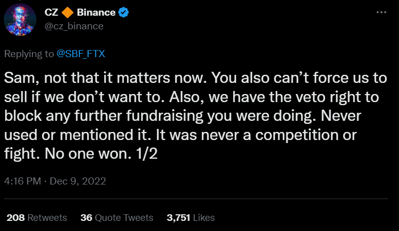 В ответ на это глава Binance заявил, что все это неважно и добавил, что FTX не имела права требовать от Binance продажи доли.