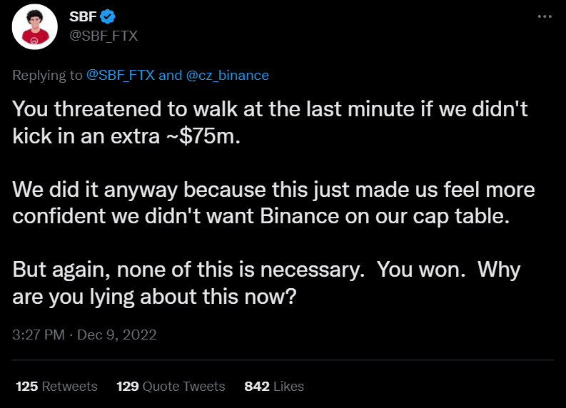 Представители криптобиржи Binance вымогали с руководства ныне обанкротившейся криптобиржи FTX бонусные $75 млн за продажу своей доли. Об этом в твиттере заявил основатель обанкротившейся криптобиржи FTX Сэм Бэнкман-Фрид.