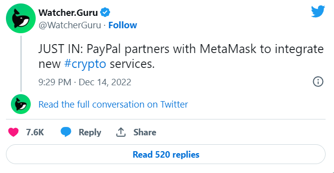 Партнерство с Metamask — это еще один момент, когда PayPal и криптоактивы объединяются. Партнерство продолжает интеграцию цифровых активов, которые были в центре внимания финансовой фирмы с 2020 года.