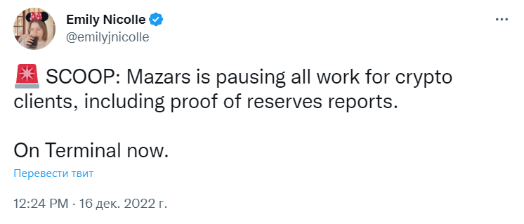И только что появилась информация о том, что аудитор резервов Binance компания Mazars приостановила работу с крипто-клиентами, включая проведение аудита резервов криптобирж. Еще один сигнал о том, что не все так гладко и прозрачно в сфере аудита резервов.