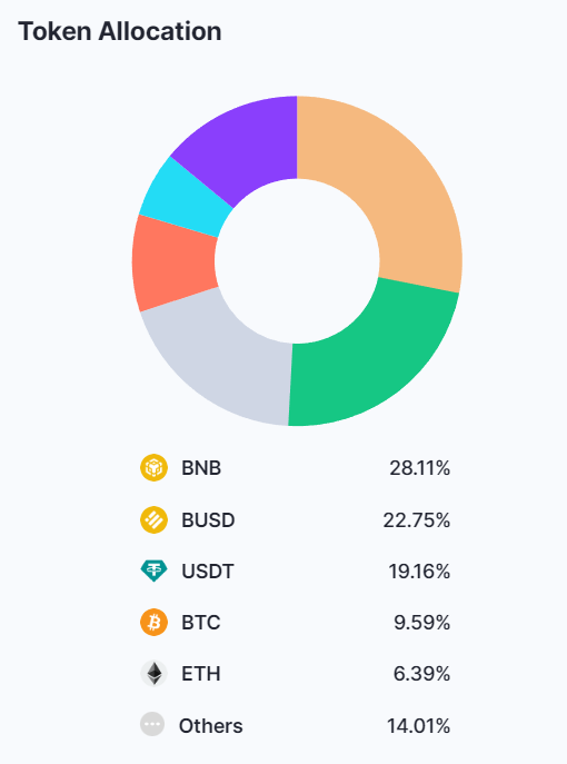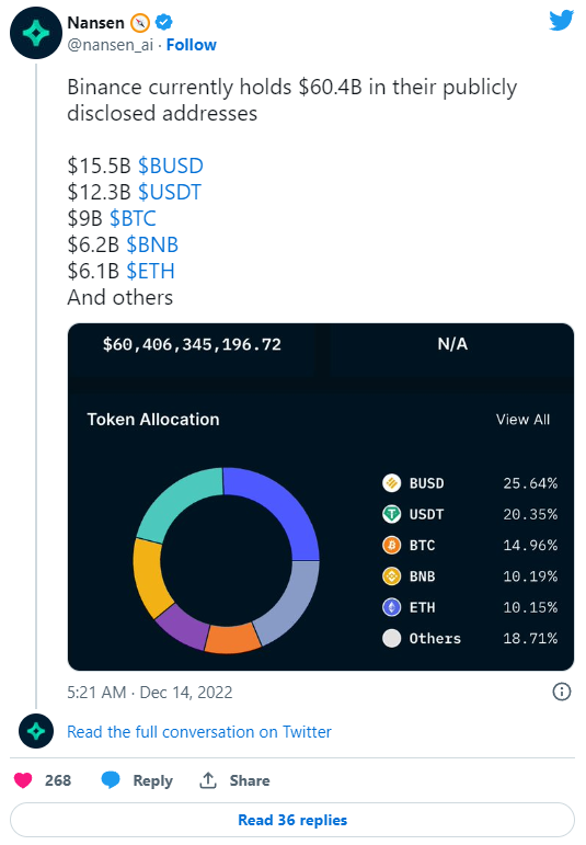По данным Nansen, примерно 10% резервов биржи хранится в ее монете. Согласно общедоступным адресам, Binance в настоящее время имеет активы на сумму 60,4 миллиарда долларов, из которых 6,2 миллиарда долларов составляют BNB.