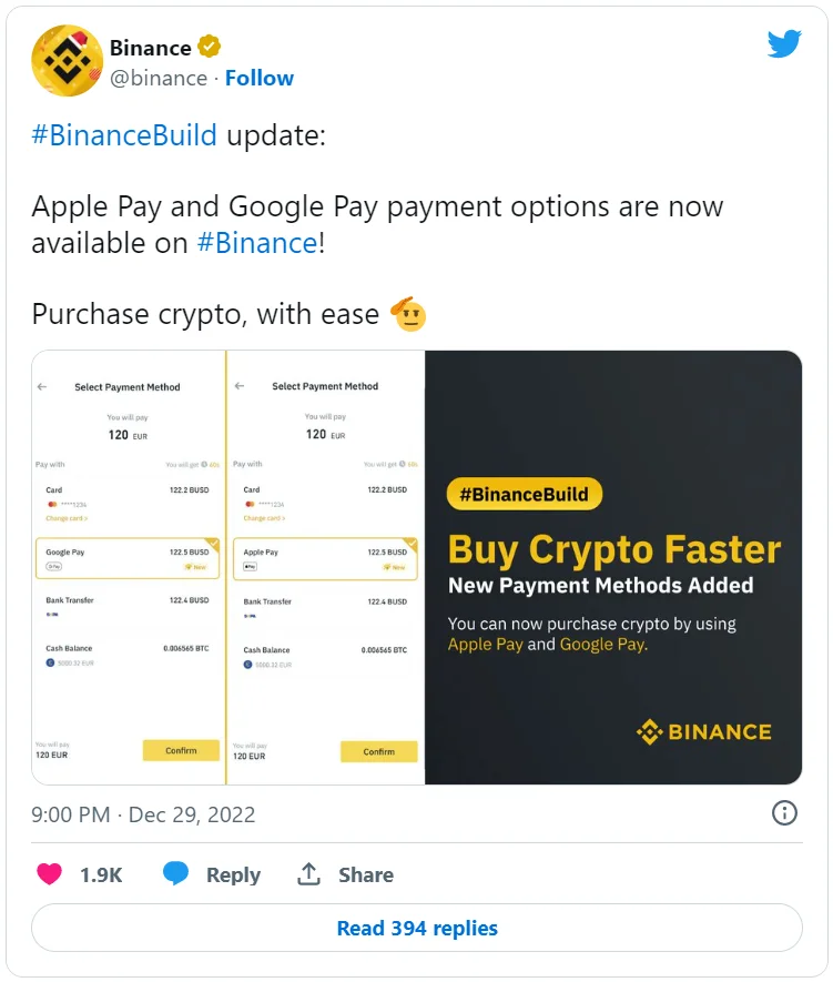 Что произошло? 29 декабря криптовалютная биржа Binance объявила о новой функции. Теперь клиентам платформы доступна покупка цифровых активов через системы платежей Apple Pay и Google Pay. Комиссия составляет примерно 2% за транзакцию. Об этом сообщается в Twitter-аккаунте Binance.
