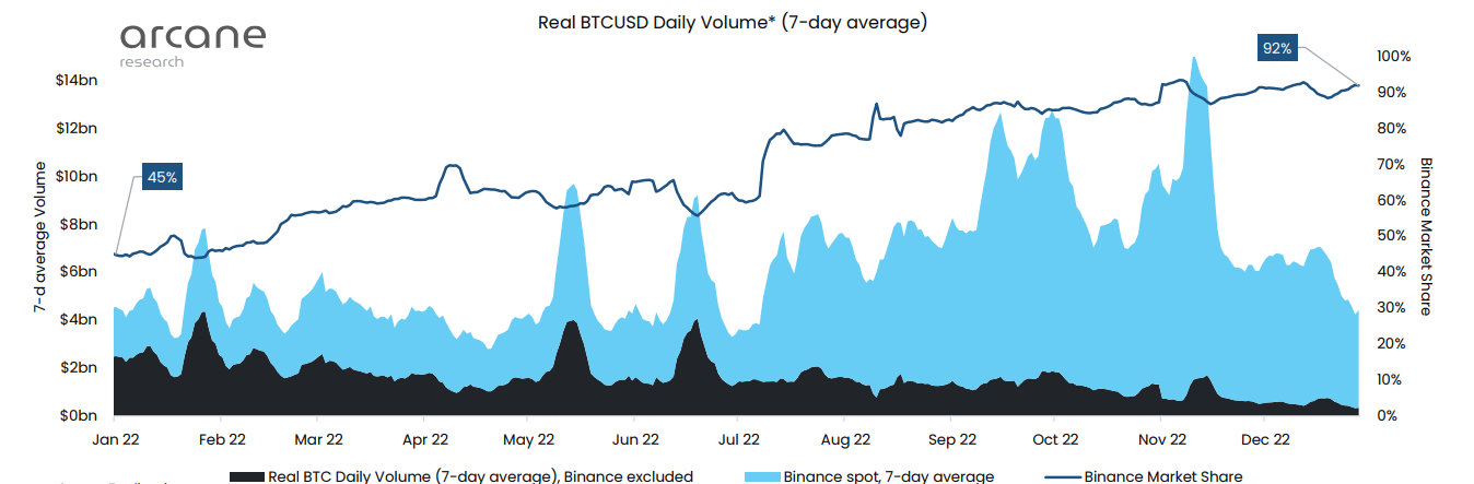 По данным Arcane Research, в течение 2022 года с банкротством FTX и крахом Celsius криптовалютная биржа Binance стала явным лидером.