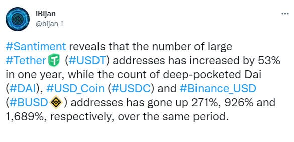 USDT оказался менее привлекательным коином для крупного капитала в сравнении с конкурентами. Сервис Santiment раскрывает: за год число USDT-счетов с крупными суммами выросло на 53%. USDC и BUSD (Binance USD) за тот же период расширили аудиторию на 926% и 1 689%.