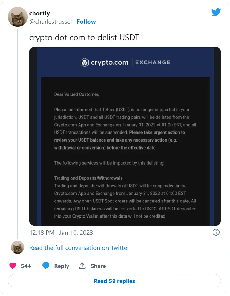 Что произошло? Криптовалютная биржа Crypto.com разослала канадским пользователям уведомление о прекращении поддержки стейблкоина USDT от эмитента Tether. Начиная с 31 января стабильная монета и все связанные с ней торговые пары будут удалены с платформы. Об этом 10 января сообщил пользователь Twitter с псевдонимом chortly.